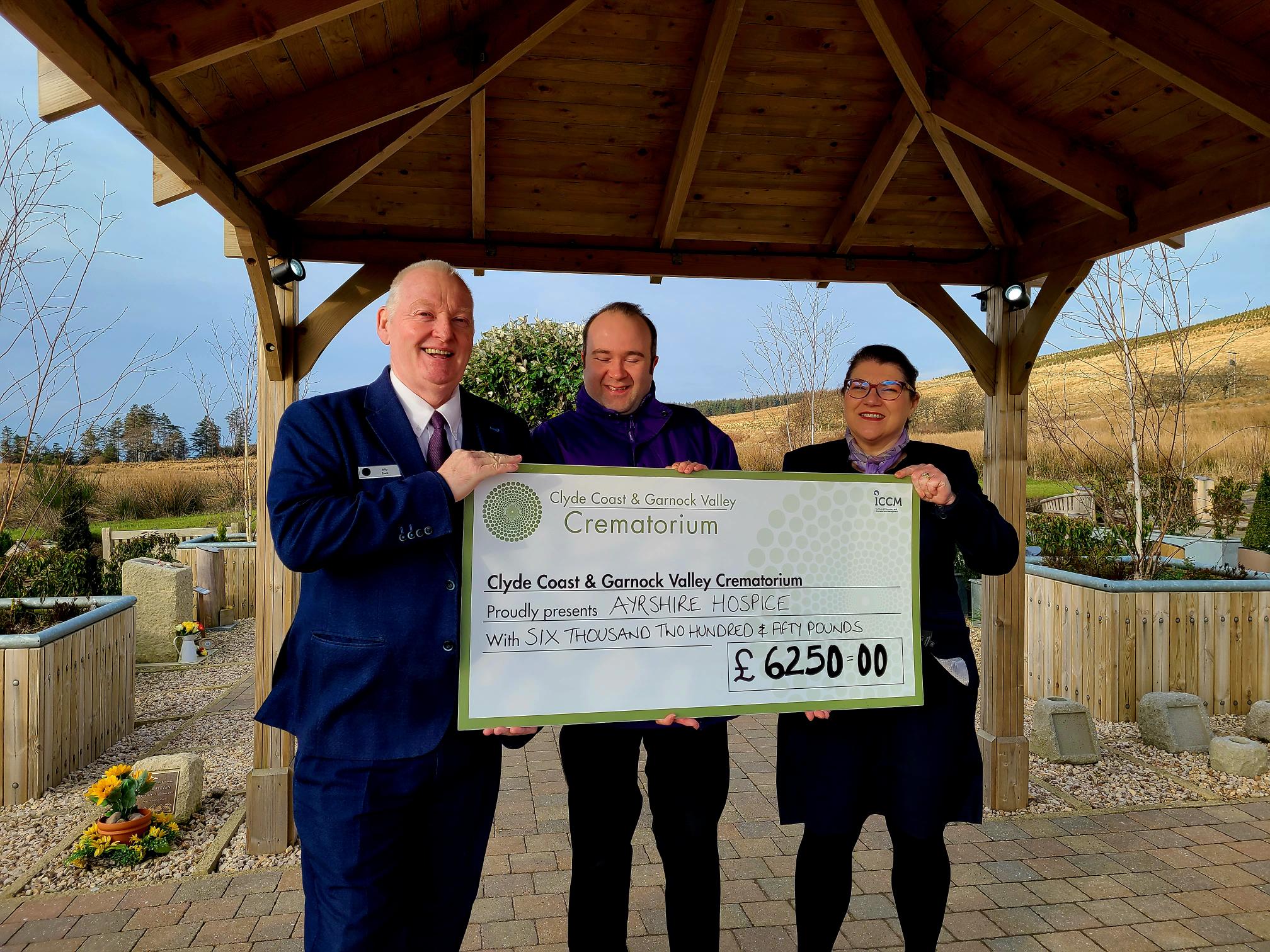 The team from Clyde Coast and Garnock Valley Crematorium is thrilled to donate £6250 to Ayrshire Hospice and £6250 to CHAS (Children’s Hospices Across Scotland) through its membership of the Institute of Cemetery and Crematorium Management’s Recycling of Metals Scheme.