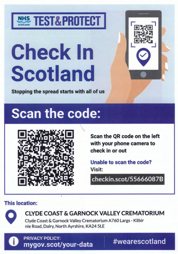 We ask that mourners check-in for services using our QR Code which is displayed throughout the Crematorium.